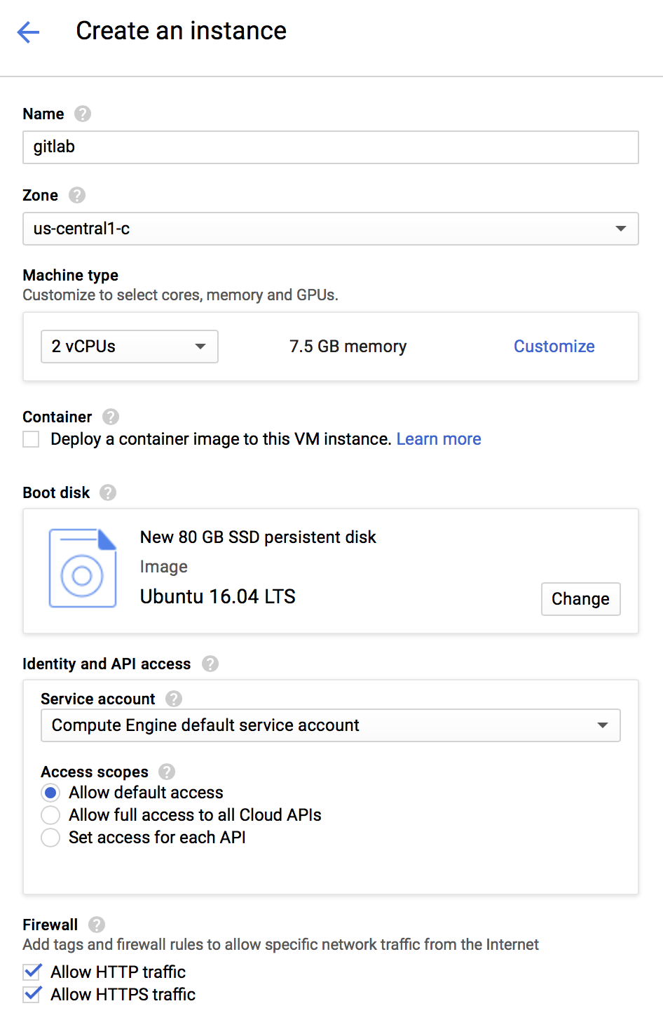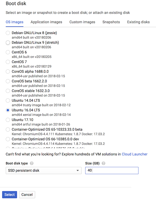 Click Change under Boot disk to select the size, type, and desired operating system. GitLab supports a variety of linux operating systems, including Ubuntu and Debian. Click Select when finished.