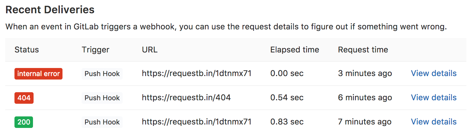 If you need more information about execution, you can click View details link. On this page, you can see data that GitLab sends (request headers and body) and data that it received (response headers and body).